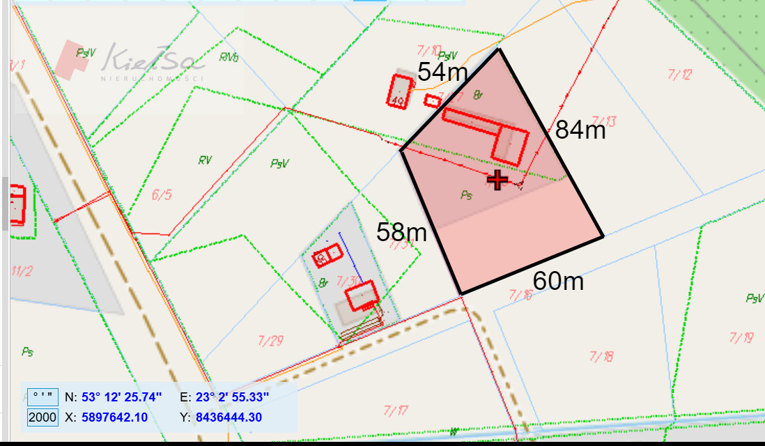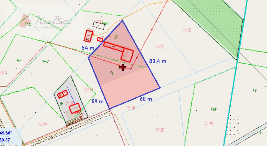 Działka o powierzchni 3981 m2, zabudowana budynkiem gospodarczym o powierzchni 139 m2 oraz budynkiem mieszkalnym do adaptacji o pow. zabudowy 100 m2.