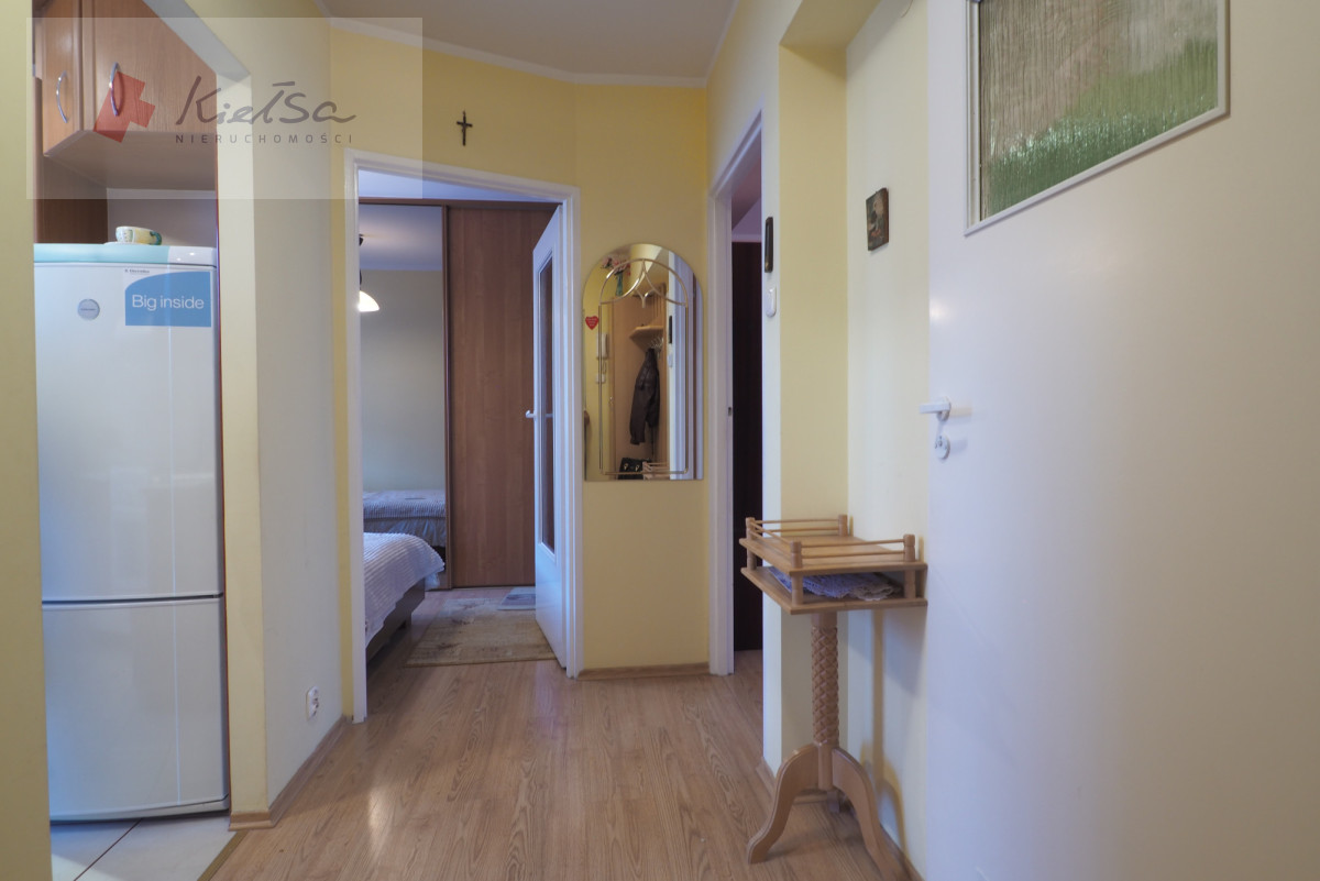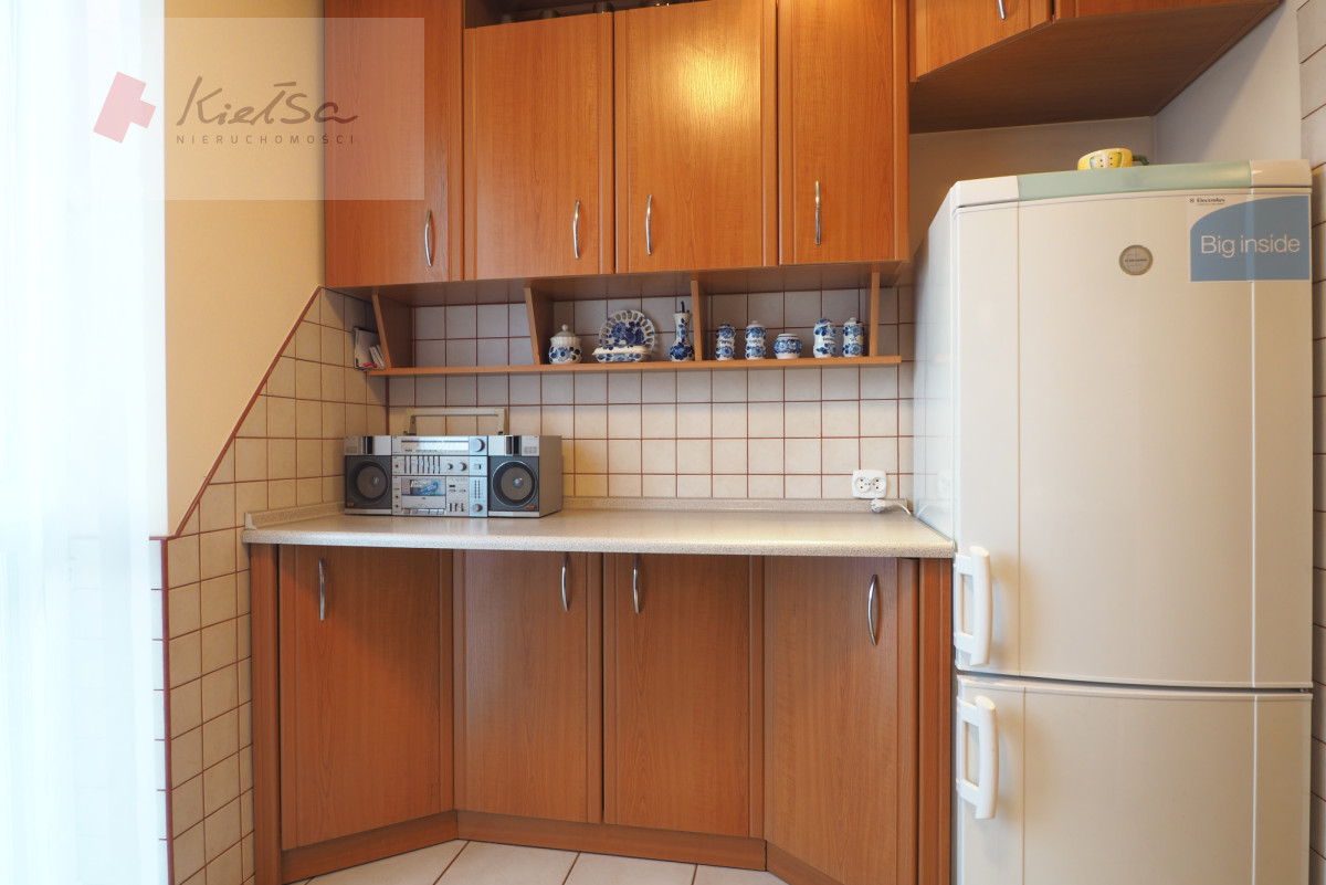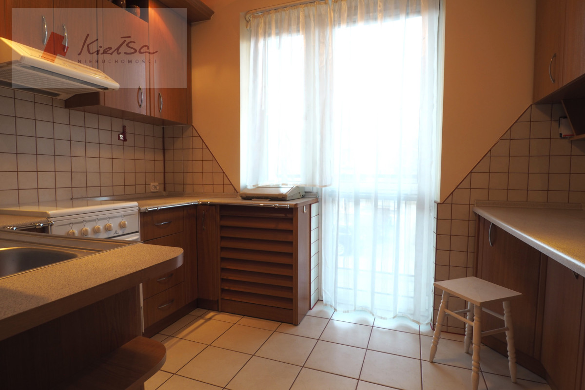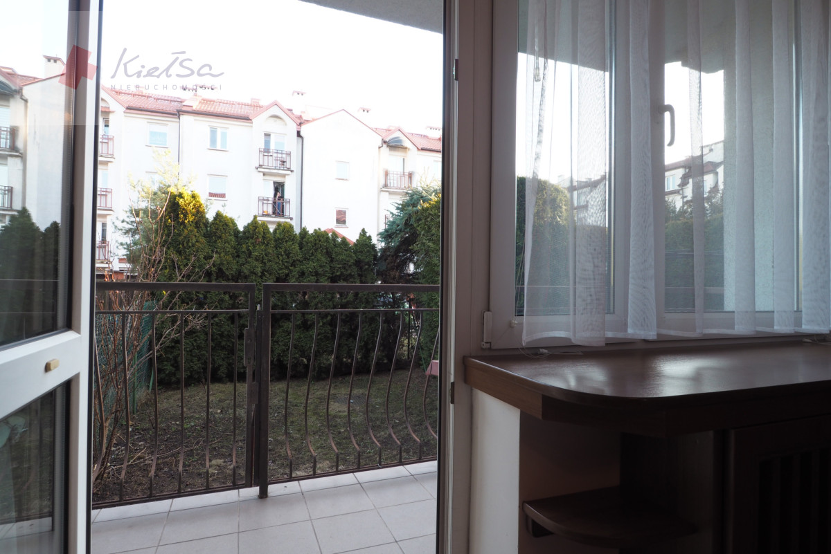 Duża kwadratowa kuchnia z wyjściem na drugi balkon, rozwiązanie bardzo funkcjonalne i rzadko spotykane w blokach.